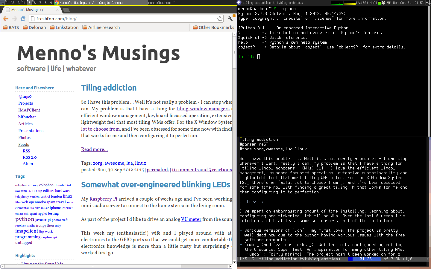 So I have this problem ... Well it's not really a problem - I can stop whenever I want, really I can. My problem is that I have a thing for tiling window managers (WMs)1. I love the efficient window management, keyboard focussed operation, extensive customisability and lightweight feel that most tiling WMs offer. For the X Window System 2 there's an awful lot to choose from, and I've been obsessed for some time now with finding a great tiling WM that works for me and then configuring it to perfection.